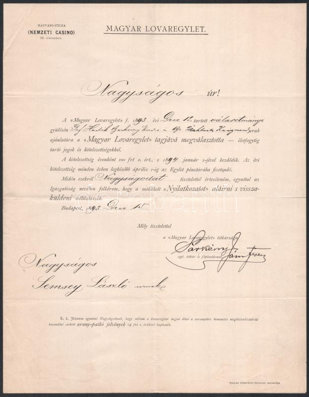 Description: 1893 Magyar Lovaregylet értesítése Dr. semsei gróf Semsey László (1869-1943) politikus, nagybirtokos részére az egylet tagjává választásról, Sárkány János Ferenc (1833-1907) egyleti titkár és főpénztárnok, sportíró, szerkesztő aláírásával, fejléces papíron,szakadással.