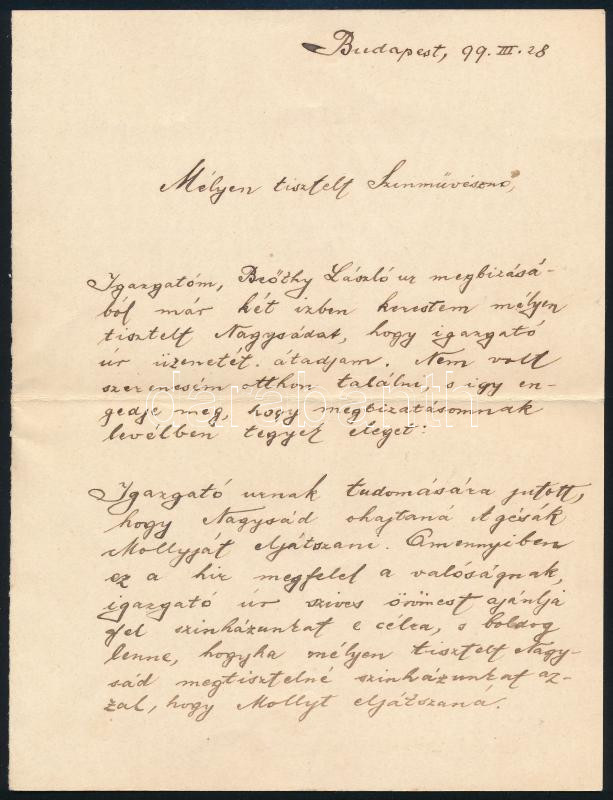 1899 Palásthy Géza (1869-1914) a Magyar Színház ellenőre, titkára sajá... https://www.darabanth.com/en/442-Online-auction/442.0/Art-and-other-collectibles/Historical-documents-manuscripts~500022/1899-Palasthy-Geza-1869-1914-a-Magyar-Szinhaz-ellenore-titkara-sajat-kezzel-irt-levele-~II2913056