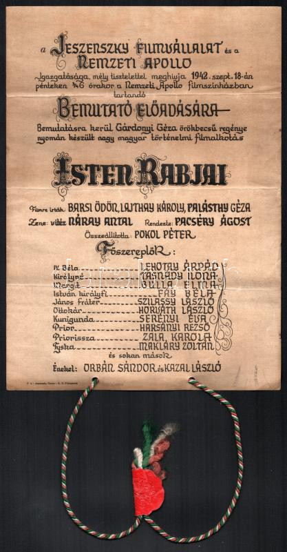 1942 Jeszenszky Filmvállalat és Nemzeti Apollo által Gárdonyi Géza Isten Rabjai c. film bemutató előadásának meghívója