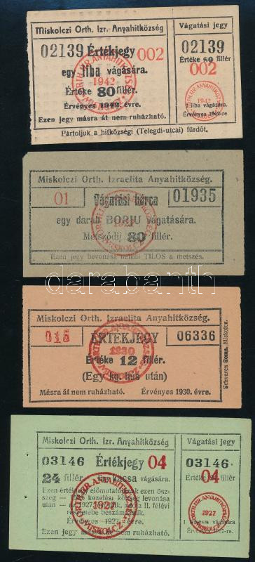 1927-1942 Miskolczi Orth. Izraelita Anyahitközség, 4 db különféle értékjegy / vágatási bárca