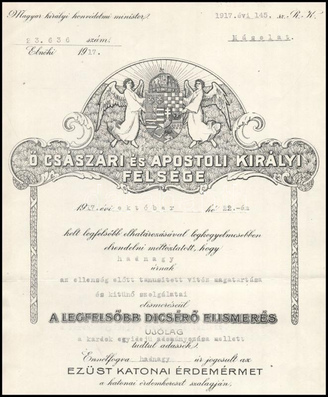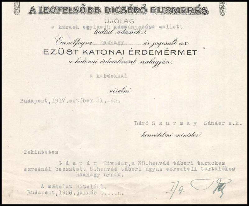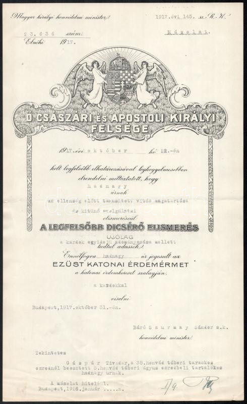 Description: 1917 Ezüst katonai érdemérem a katonai érdemkereszt szalagján a kardokkal adományozó oklevél, fejléces címeres papíron, 38. honvéd tábori tarackos ezrednél szolgáló hadnagy részére, beazonosítandó aláírással, apró lapszéli szakadással