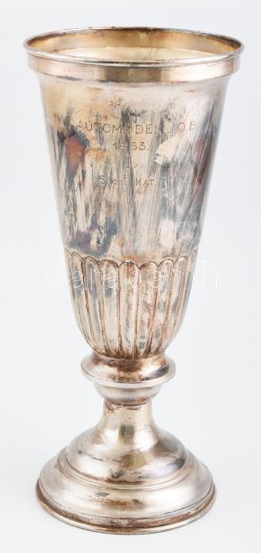 Description: Automodellezés Budapest 1963 VI. Automodell OB I. helyezett5 cm3 kat. Ezüstözött fém serleg gravírozott felirattal 28 cm