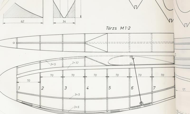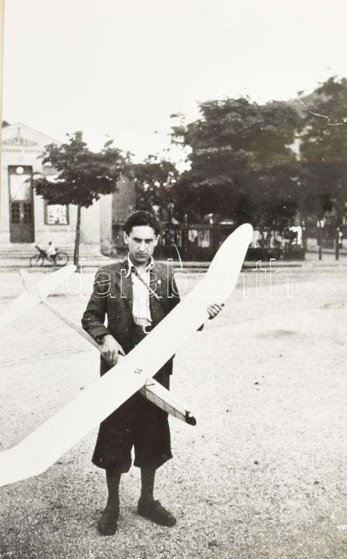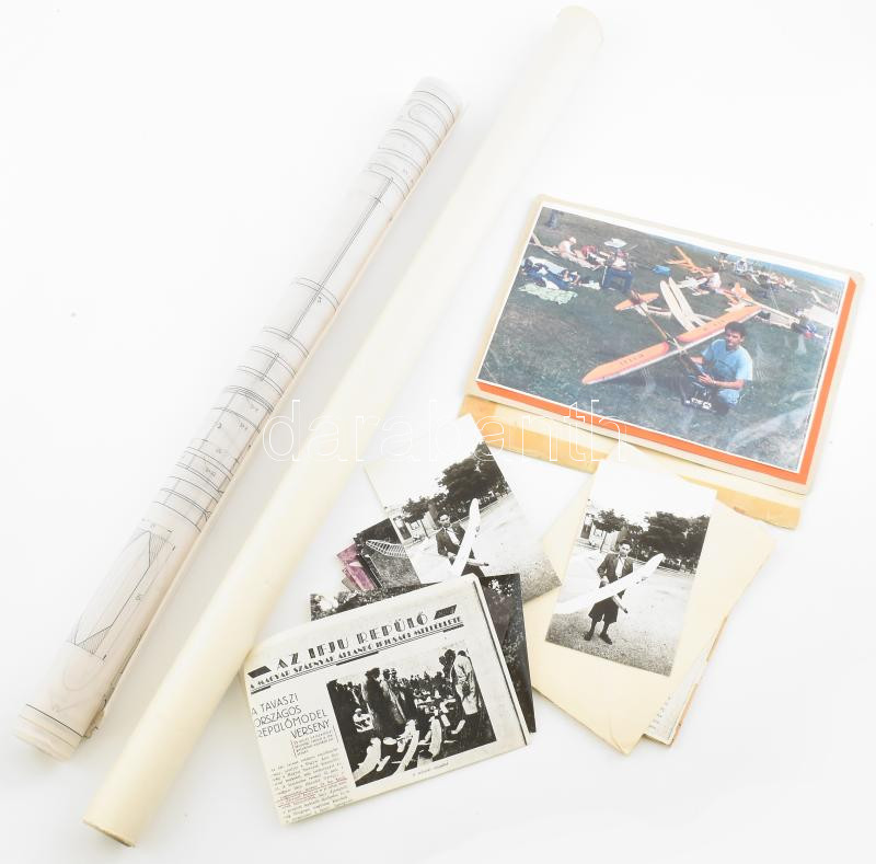 Repülőmodellezés - A HEV-14 vitorlázó modell egy pauszpapírra tussal rajzolt és egy sokszorosított eredeti tervrajza. A modell Horváth Ernő legismertebb modellje, mellyel 1939-ben távolsági világcsúcsot ért el. Az eredeti repülőgép-modellt készítője a Közlekedési Múzeumnak adományozta. Hozzá tartozik 22 eredeti fotó (részben 1938-39-ből), amelyek a modellt és készítőjét ábrázolják, egy újságkivágás, egy negatív, 2 színes fénykép a modellt később újra megépítő német modellezőről, egy kiállítási névtábla, a modell nyomtatásban is megjelent tervrajza, valamint Rechnitzer Ferenc repülőmodellező 1939. június 16-án kelt autográf levelezőlapja Horváth Ernőnek, melyben gratulál az új rekordhoz. Prov.: Horváth Ernő (1916-2015) világ- Európa- és magyar bajnok repülő és -autómodellező, távolsági világcsúcstartó, a MÁV repülőmodellező klub vezetője hagyatékából.