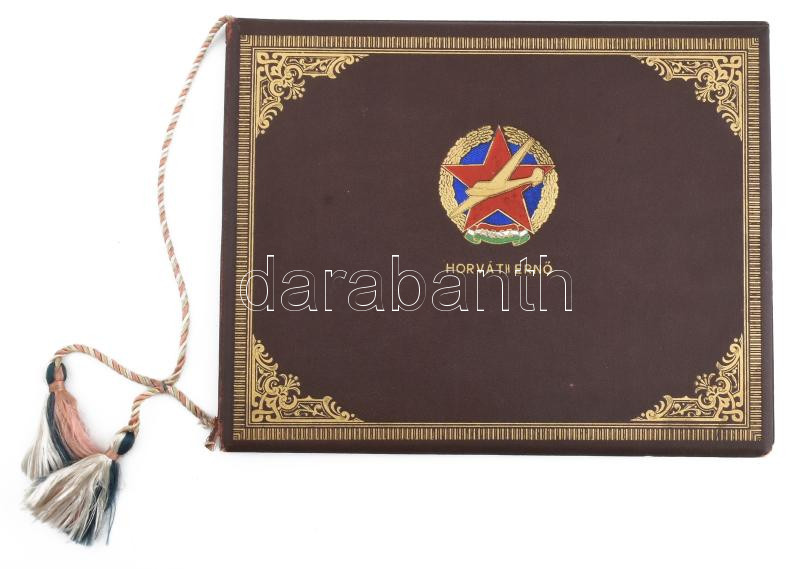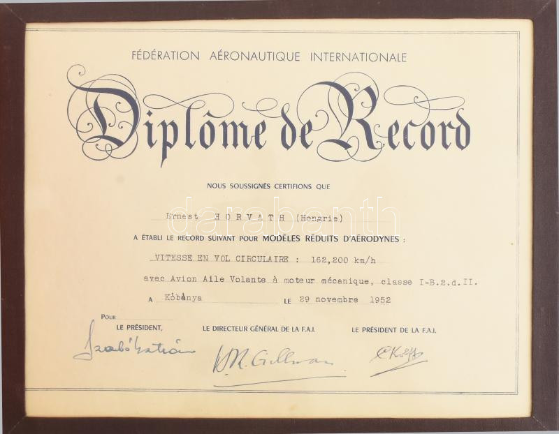 Repülőmodellezés - Kőbánya, 1952. november 29. Diplome de Record - a Nemzetközi Repülő Szövetség (Fédération Aéronautique Internationale) francia nyelvű oklevele Horváth Ernő részére, aki kategóriájában repülőmodelljével 162,200 km/órás sebességével új rekordot állított fel. A szövetség vezetőinek autográf aláírásaival, gerincénél zsinórral átfűzött, első tábláján a Magyar Repülő Szövetség festett címerével díszített, aranyozott vászonkötésben. Prov.: Horváth Ernő (1916-2015) világ- Európa- és magyar bajnok repülő és -autómodellező, távolsági világcsúcstartó, a MÁV repülőmodellező klub vezetője hagyatékából.