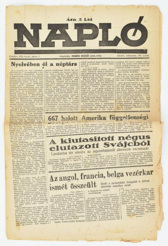 1936 Napló c. magyar nyelvű nagyváradi lap 1936. júl. 7-i száma, benne érdekes írásokkal, hirdetésekkel. Kisebb lapszéli sérülésekkel, foltokkal, 8 p.