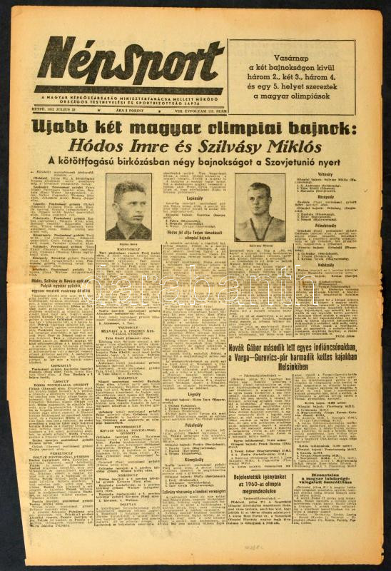 1952 Népsport VIII. évf. 152. sz., 1952. júl. 28., a Helsinki olimpia ... https://www.darabanth.com/en/442-Online-auction/442.0/Art-and-other-collectibles/Printed-Materials~1000005/1952-Nepsport-VIII-evf-152-sz-1952-jul-28-a-Helsinki-olimpia-hireivel-Hodos-Imre-es-~II2878663
