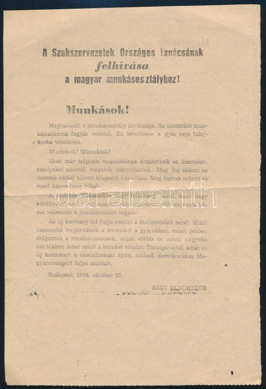 1956 SZOT Felhívása, a hátoldalán az új nemzeti kormánnyal, valamint a...