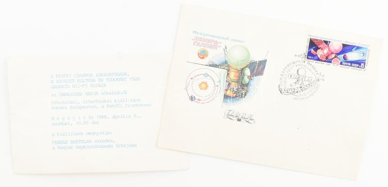 1988 Gagarin Sci-fi Club űrkutatási kiállítás meghívó, kapcsolódó tematikájú borítékkal