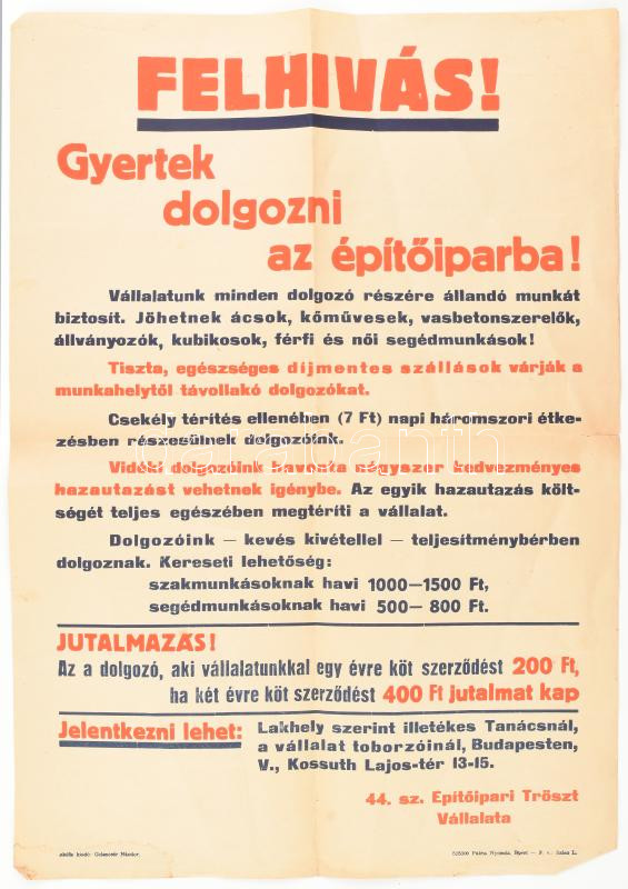 "Felhívás! Gyertek dolgozni az építőiparba!" plakát, hajtott...