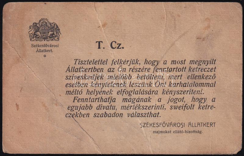 Description: cca 1910 Székesfővárosi (budapesti) Állatkert, humoros nyomtatvány (... az Ön részére fenntartott ketreczet szíveskedjék mielőbb betölteni...), törésekkel, kissé foltos, 9x14 cm