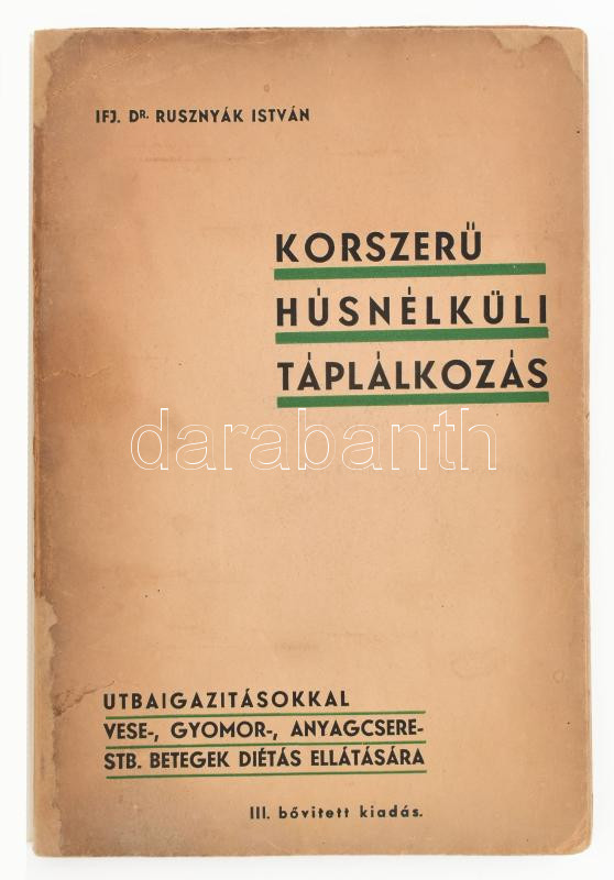 Ifj. Dr. Rusznyák István: Korszerű húsnélküli táplálkozás. Útbaigazításokkal és konyhareceptekkel vese-, gyomor-, anyagcsere- stb. betegek diétás ellátására. 6 táblázattal, étrendi tanácsokkal, 358 recepttel és 94 összeállított menüvel. Bp., é.n., Szathmáryné Bánó Vilma. 3. bővített kiadás. Kiadói papír kötésben, restaurált, kissé foltos borítóval, helyenként felvágatlan lapokkal, néhány lapszéli, szöveget nem érintő sérüléssel, modern védőborítóban.