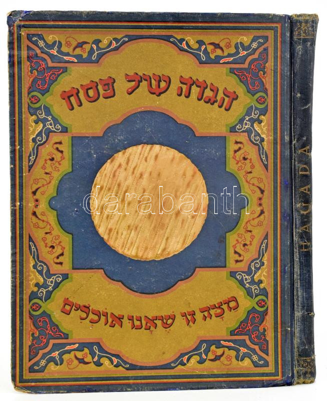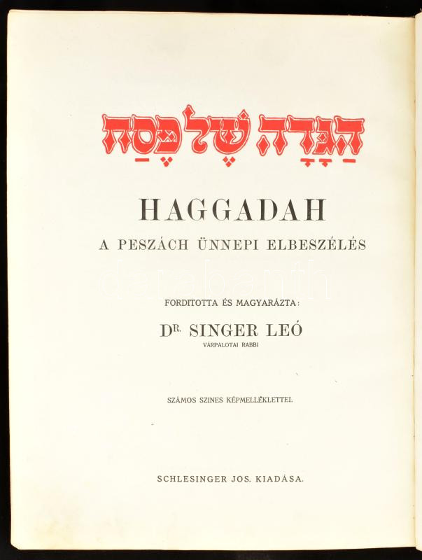 Description: Haggadah. A peszách ünnepi elbeszélés. Ford. és magyarázta: Dr. Singer Leó. Bp., é.n. (cca 1920), Schlesinger Jos. (Neuwald Illés-ny.), 6 sztl. lev. + 64 p. Egészoldalas, színes illusztrációkkal. Magyar és héber nyelven. Kiadói félvászon-kötés, kissé sérült, helyenként kissé foltos lapokkal, 1929-es ajándékozási bejegyzéssel.