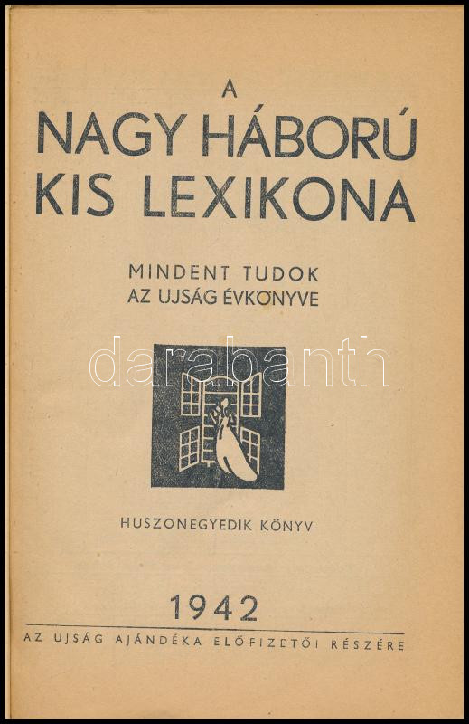 1942 A nagy háború kis lexikona. Mindent tudok - Az Ujság évkönyve. XX... https://www.darabanth.com/en/442-Online-auction/442.0/Books/Books-Military~1000011/1942-A-nagy-haboru-kis-lexikona-Mindent-tudok-Az-Ujsag-evkonyve-XXI-konyv-Az-Ujsag-aja~II2875140