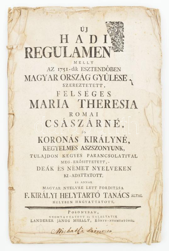 Új hadi regulamen'(tum) melly az 1751 esztendőben Magyar Ország Gyűlése szereztetett Felséges Maria Theresia romai császárné, és koronás királyné, kegyelmes asszonyunk, tulajdon kegyes parancsolataival meg-erősítetett, deák és német nyelveken ki-adattatott. És annak magyar nyelvre lett fordítása F: Királyi Helytartó Tanács által helyben hagyattatott. Posonyban, (1751), Landerer János Mihály, 15 sztl. Borító nélküli példány, a címlap levált, a címlapon és az utolsó 3 lap sérült, rajtuk szöveget is érintő hiánnyal, szakadozott lapszélekkel, foltos lapokkal.