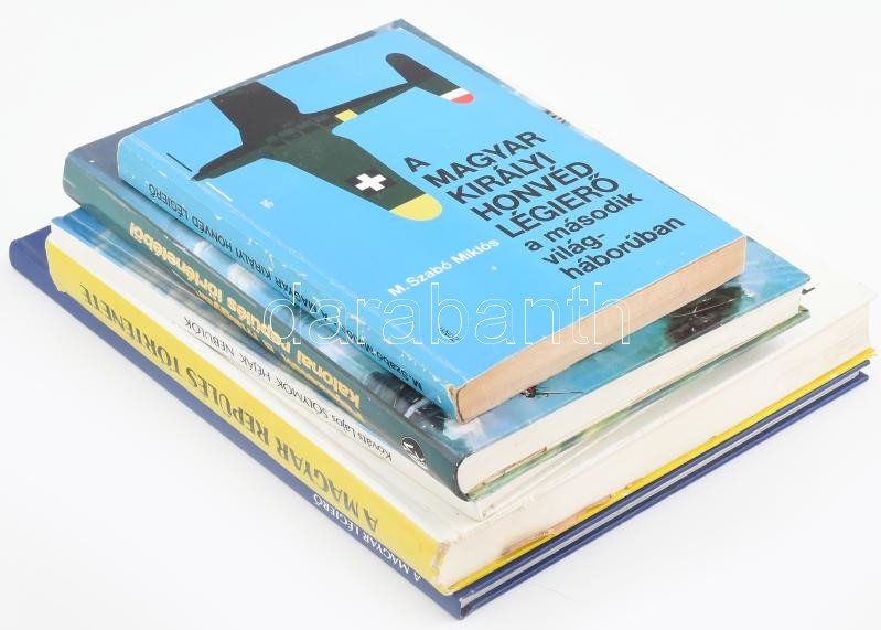 Vegyes repüléssel kapcsolatos tétel, 5 db: A magyar légierő. Bp., 2004., Zrínyi. Kiadói kartonált papírkötés; Csanádi-Nagyváradi-Winkler: A magyar repülés története. Bp., 1977., Műszaki. Kiadói kartonált papírkötés; M. Szabó Miklós: A magyar királyi honvéd légierő a második világháborúban. Bp., 1987, Zrínyi. Kiadói papírkötésben.; Kováts Lajos: Sólymok, héják, nebulók. A Magyar Kir. Állami Vas-, Acél- és Gépgyárak Repülőgépgyárának tevékenysége 1936-1944. Bp., 1990, MAHIR. Kiadói kartonált kötés.; Nagyváradi Sándor - M. Szabó Miklós - Winkler László: Fejezetek a magyar katonai repülés történetéből. Bp., 1986., Műszaki. Kiadói kartonált papírkötés;