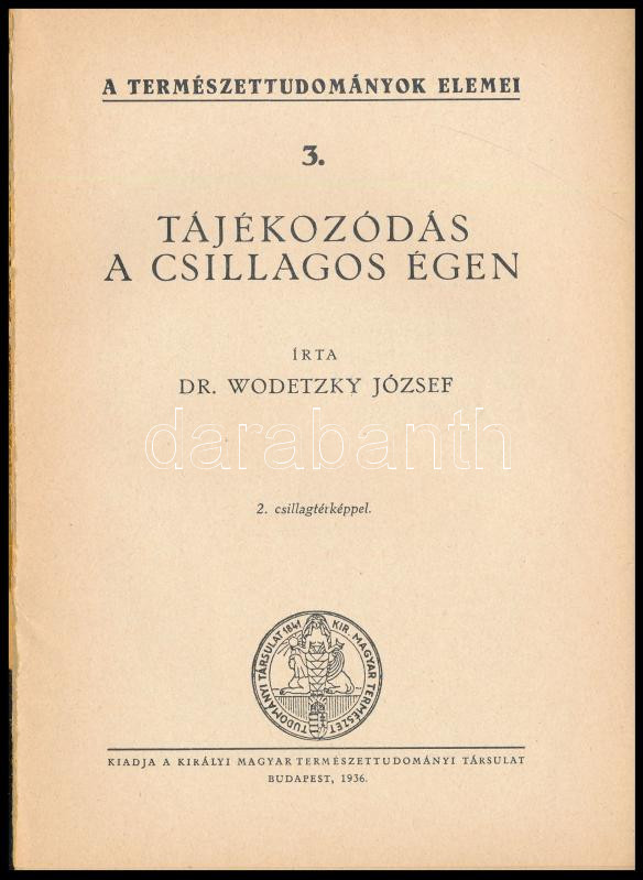 Dr. Wodetzky József: Tájékozódás a csillagos égen. A Természettudomány... https://www.darabanth.com/en/442-Online-auction/442.0/Books/Books-Natural-sciences-Medicine~1000016/Dr-Wodetzky-Jozsef-Tajekozodas-a-csillagos-egen-A-Termeszettudomanyok-Elemei-3-Bp-1936~II2839890