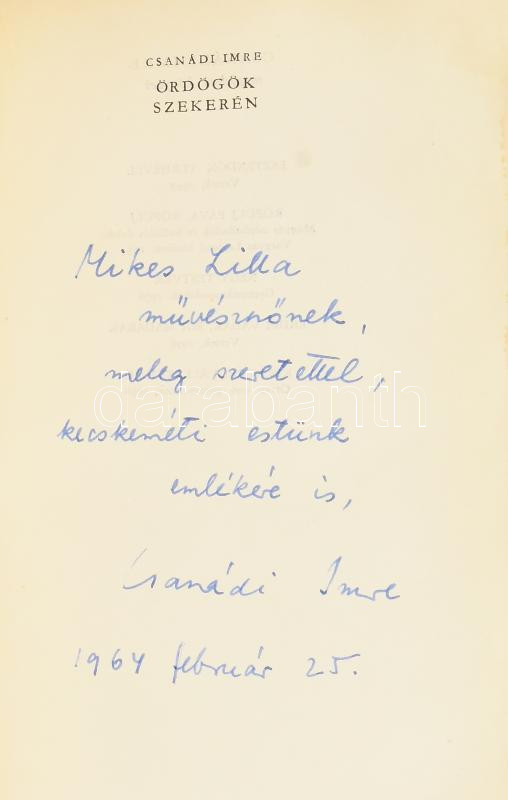 https://www.darabanth.com/en/442-Online-auction/442.0/Books/Books-Other-rarities~1000027/Csanadi-Imre-Ordogok-szekeren-Versek-1938-1963-DEDIKALT-Bp-1963-Szepirodalmi-Kiadoi-~II2910858