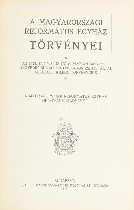 A Magyarországi Református Egyház törvényei az 1928. évi május hó 8. n... https://www.darabanth.com/en/442-Online-auction/442.0/Books/Books-Religion~1000022/A-Magyarorszagi-Reformatus-Egyhaz-torvenyei-az-1928-evi-majus-ho-8-napjan-megnyilt-negye~II2914069