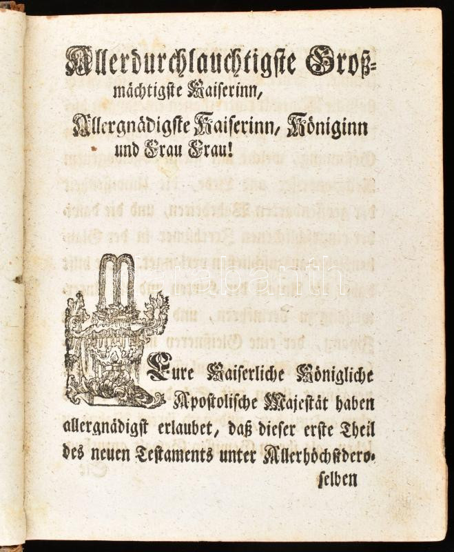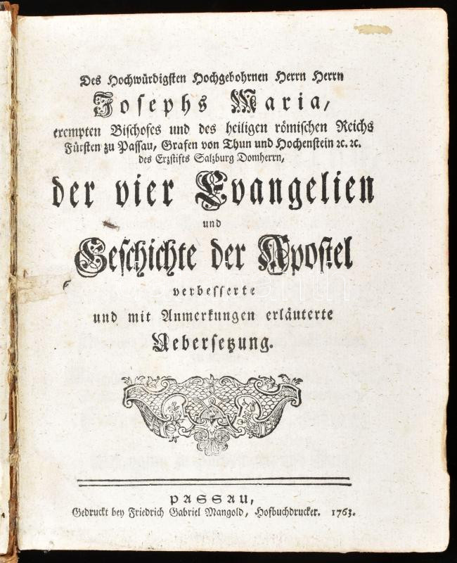 Der vier Evangelien und Geschichte der Apostel verbesserte und mit Anmerkungen erläuterte Uebersetzung. Passau, 1763. Gabriel Mangold.691 p + 18. Korabeli bordázott egészbőr kötésben, Egy két lap széle kissé sérült