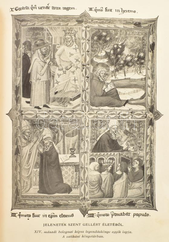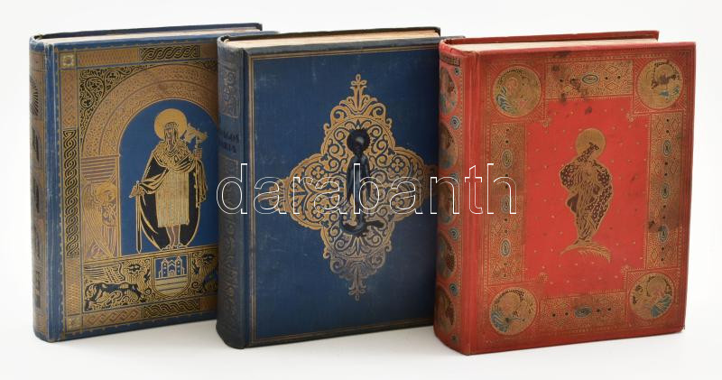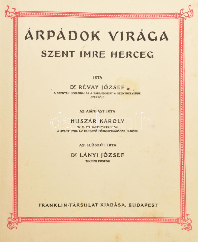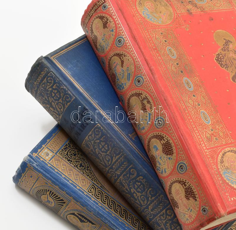 Szentek életével foglalkozó könyvtétel, közte Szent Imre, két könyvben Jaschik Álmos illusztrációival, 3 kötet: Szentek legendái. Régi és új legendás könyvekből fordította és összeállította Dr. Révay József. Az elöljáró beszédet írta Dr. Leopold Antal. A könyvdíszeket és a könyv kötését Jaschik Álmos tervezete és rajzolta. Bp.,[1926], Franklin, XV+456 p. +16 t. Eg Kiadói dúsan aranyozott, festett egészvászon-kötésben, kopott borítóval, a hátsó szennylap sérült, kissé hiányos.; A boldogságos Szűz Mária élete, tisztelete, szenthelyei, legendái. Szerk.: Lévay Mihály. A könyvdíszeket és a könyv kötését Surányi István tervezete és rajzolta. Bp., [1934], Franklin, 511 p. +13 t. Kiadói dúsan aranyozott, festett egészvászon-kötésben, kopott borítóval, egy táblán szakadással.; Révay József: Árpádok virága. Szent Imre herceg. Az ajánlást írta: Huszár Károly. Az előszót írta Dr. Lányi József. A könyvdíszeket és a könyv kötését Jaschik Álmos tervezete és rajzolta. Bp.,[1929.], Franklin-Társulat, XIV+391 p.+16 t. Kiadói dúsan aranyozott, festett egészvászon-kötésben, kopott borítóval.;