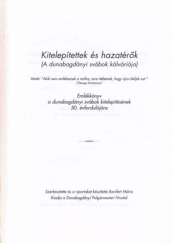 KitelepÃtettek és hazatérÅ‘k. (A dunabogdányi svábok kálváriája.) Emlékkönyv a dunabogdányi svábok kitelepÃtésének 50. évfordulójára. Szerk. és a riportokat készÃtette Bonifert Mária. Dunabogdány, én., Dubabogdányi Polgármesteri Hivatal. Fekete-fehér fotókkal illusztrált. Kiadói papÃrkötés