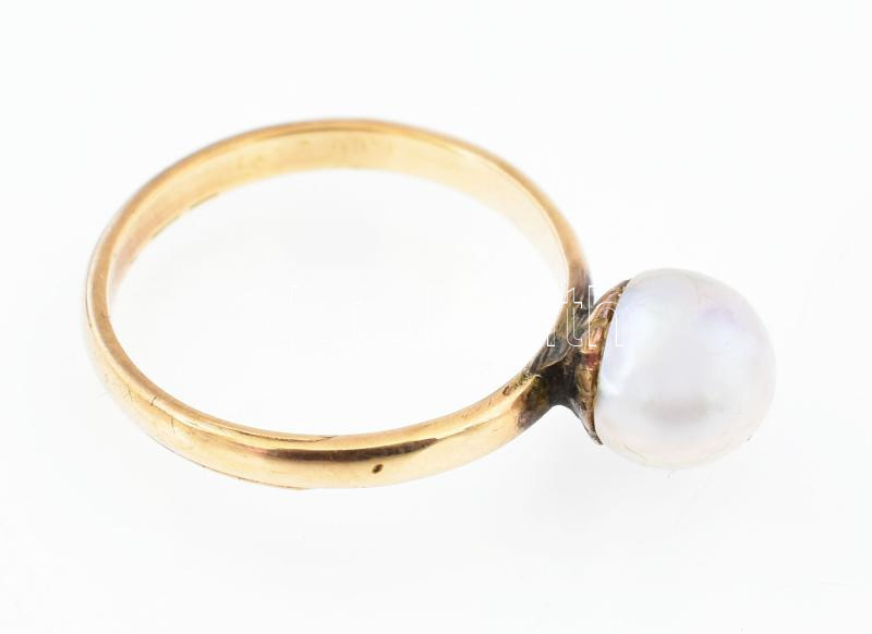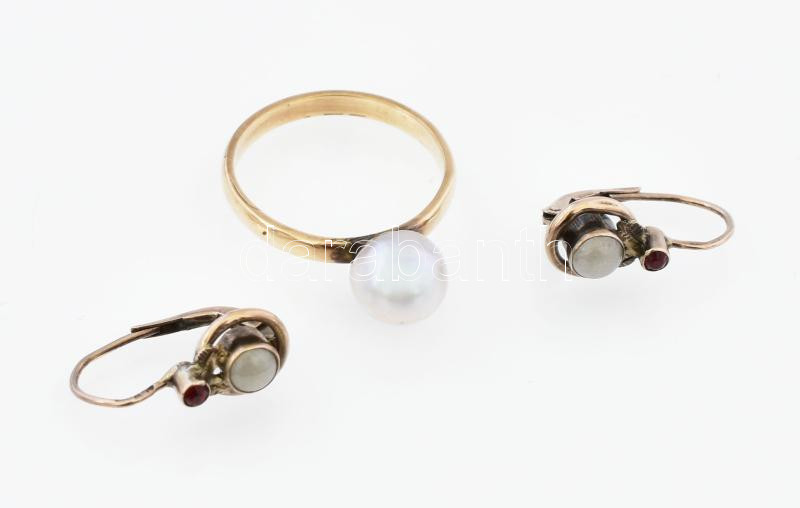 Arany (Au) 14 K gyöngyös gyűrű és fülbevalópár, jelzéssel és jelzés nélkül, bruttó: 4,2 g