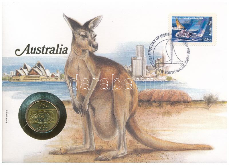 Description: Ausztrália 1994. 1$ Al-Br "A Dollár 10. évfordulós kiadása" érme felbélyegzett borítékban, első napi bélyegzéssel, német nyelvű tájékoztatóval T:UNC
