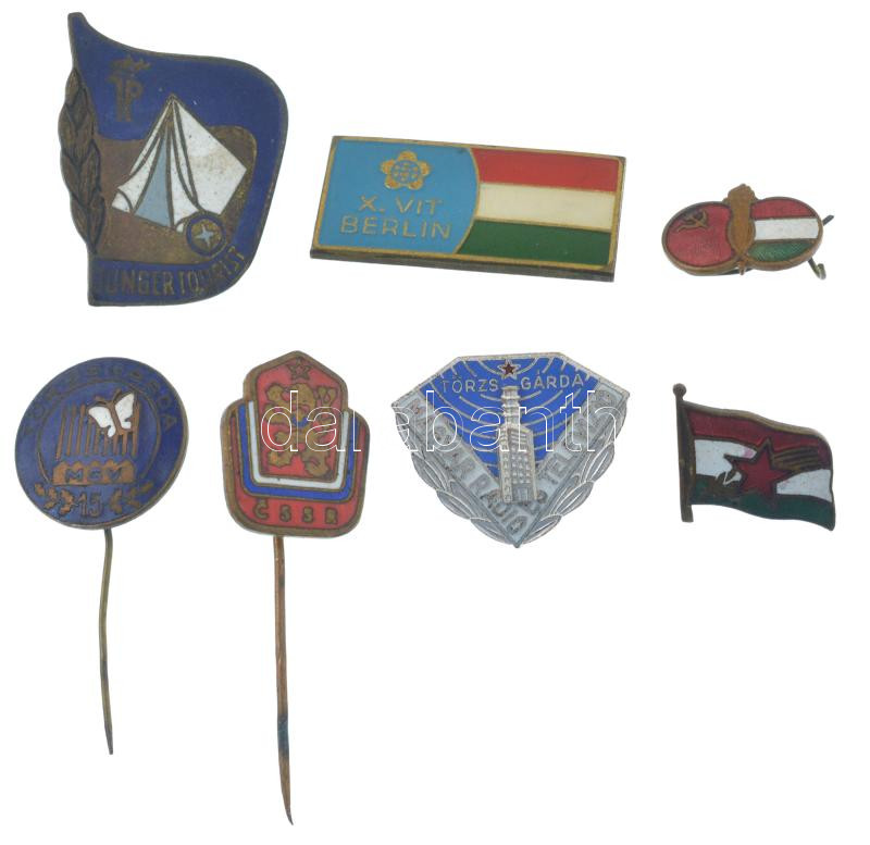 Description: 7db klf magyar és külföldi szocialista jelvény, közte "Magyar Rádió és Televízió Törzsgárda" műgyantás fém jelvény, "Junger Tourist" zománcozott fém jelvény T:XF