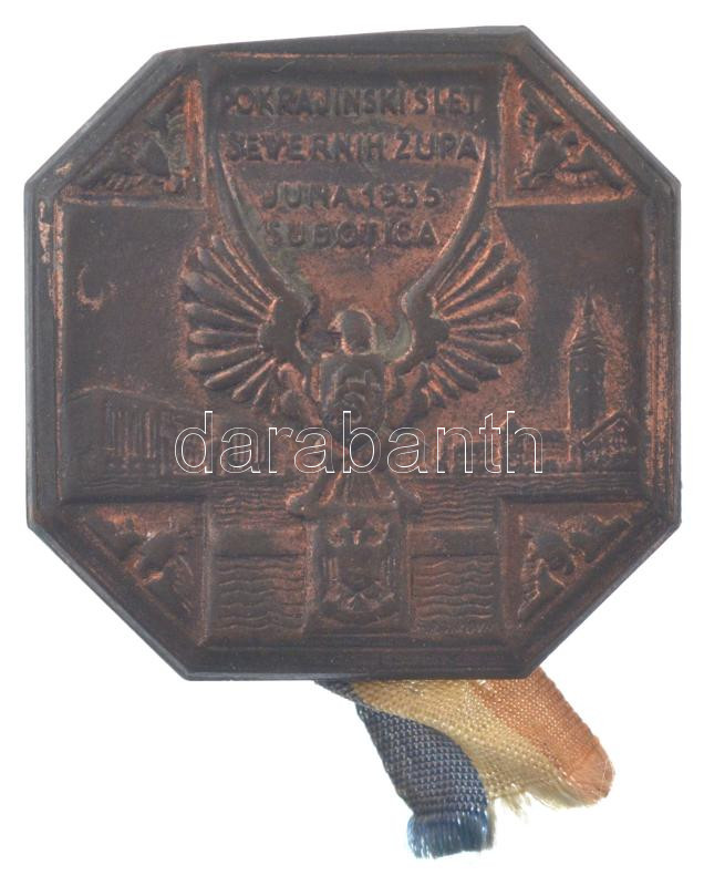 Jugoszlávia 1935. "Szabadka 1935 Június" bronz jelvény a hátoldalán "T. KRIVAK-ZAGREB" gyártói jelzéssel. Szign.: Rajkovic (35x35mm) T:VF Yugoslavia 1935. "Pokrajinski slet severnih župa Subotica Juna 1935" bronze badge with "T. KRIVAK-ZAGREB" makers mark on the back. Sign.: Rajkovic (35x35mm) C:VF