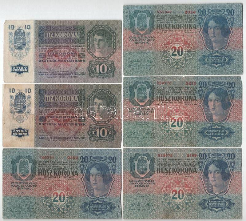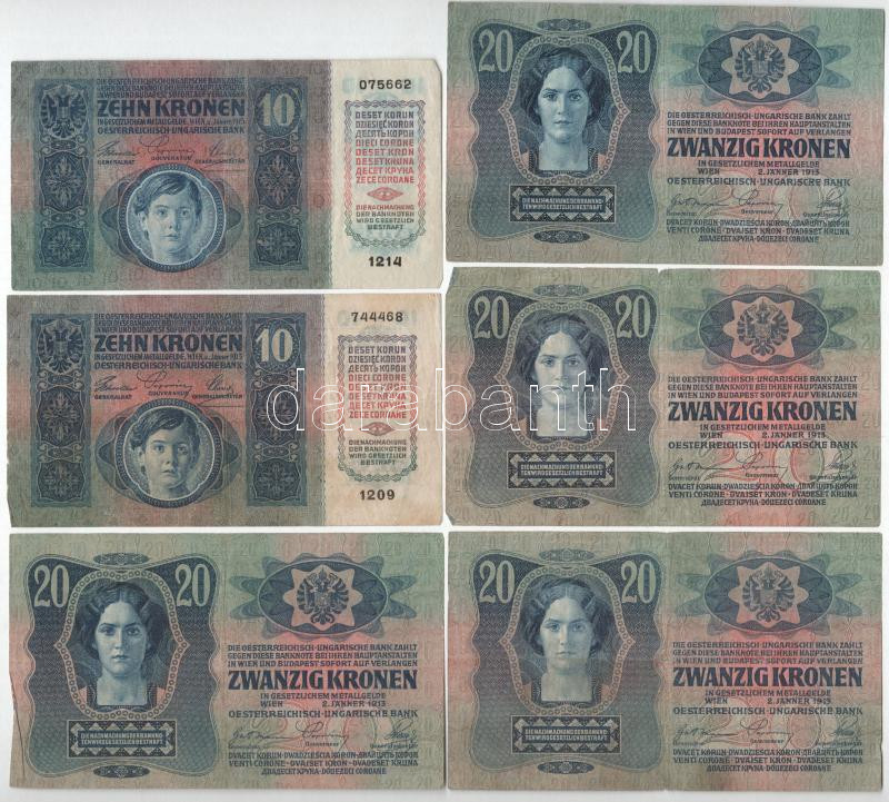 1902. 1000K + 1912. 100K (2x) + 1913. 20K (4x) + 1914. 50K + 1915. 10K (2x) mindegyik bankjegy felülbélyegzés nélkül T:VF,F közte kis szakadás