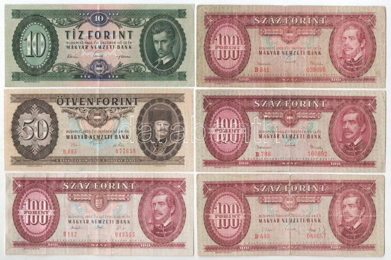 https://www.darabanth.com/en/442-Online-auction/442.0/Numismatics/Hungarian-Banknotes~1500007/1962-10Ft-plus-1962-1993-100Ft-4x-plus-1975-50Ft-TF-VG-kozte-szep-papir~II2908834