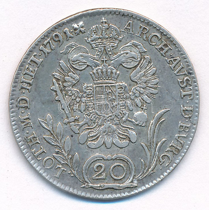 https://www.darabanth.com/en/442-Online-auction/442.0/Numismatics/Hungarian-coins-and-coins-with-Hungarian-mint-marks~1500008/1791B-20kr-Ag-II-Lipot-6-63g-T2-2-patina-Hungary-1791B-20-Kreuzer-Ag-Leopold-II-6-63g-C~II2913933