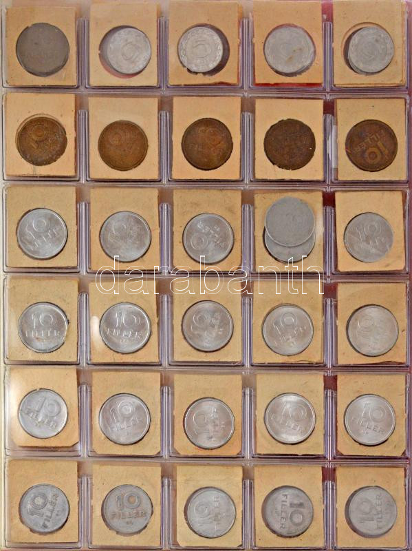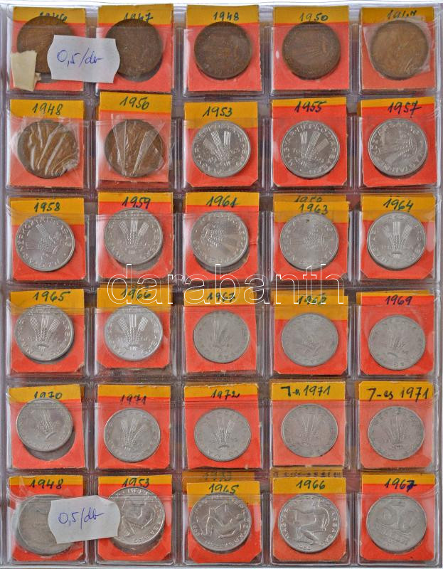 1946-1973. 188db-os rendezett forint gyűjtemény mappában, címkékkel, közte ritka évjáratokkal és az összes 1948-1973 közötti emlékkiadással, közte 1950. 2Ft "P.V. (próbaveret)" jelzéssel, 1948. 50f Al rozettával, Artex-veret, 1948. 5Ft Ag "Petőfi" + 10Ft Ag "Széchenyi" + 20Ft Ag "Táncsics" "Szabadságharc sor" (4 teljes sor!), 1956. 10Ft + 20Ft + 25Ft Ag "10 éves a Forint (Jó Forint sor)", 1961. 25Ft Ag + 50Ft Ag "Bartók Béla" pár, 1966. 25Ft Ag + 50Ft Ag "Zrínyi" pár, 1967. 25Ft Ag + 50Ft Ag + 100Ft Ag "Kodály" sor + 1968. 50Ft Ag + 100Ft Ag "Semmelweis pár". Rendkívül tartalmas anyag, induló gyűjtemény alapja is lehet! T:vegyes, patina