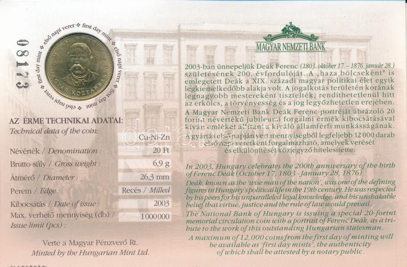https://www.darabanth.com/en/442-Online-auction/442.0/Numismatics/Hungarian-coins-and-coins-with-Hungarian-mint-marks~1500008/2003-20Ft-Cu-Ni-Zn-Deak-Ferenc-elsonapi-veret-08173-sorszamu-emleklapon-TUNC~II2906977