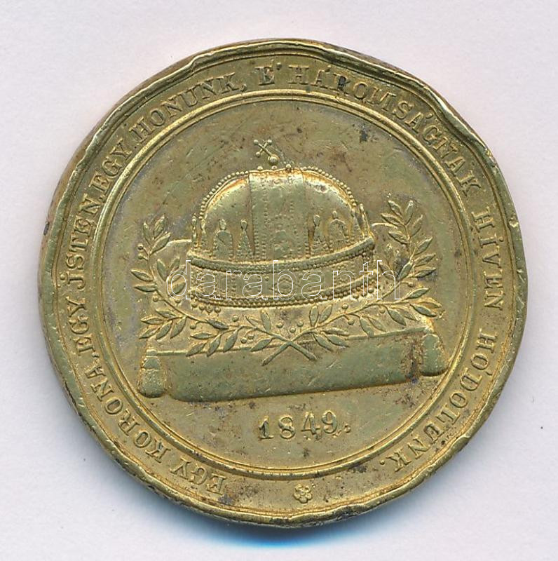 1849. "Kossuth Lajos a Magy. Orsz.Vezérje - Szül:27-dik, Ap: hav:1806. / Egy korona, egy Isten, egy honunk, E' háromságnak híven hódolunk" kétoldalas Cu emlékérem (30mm) T:VF patina, ph, ü. / Hungary 1849. "Lajos Kossuth, leader of Hungary / One Crown, One God, One Country, We worship this Trinity" two-sided Cu commemorative medallion (30mm) C:VF patina, edge error, ding