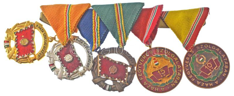 Description: 1964. "A Haza Szolgálatáért Érdemérem arany, ezüst, bronz fokozat" zománcozott kitüntetések + 1965. "Szolgálati Érdemérem - A Haza Fegyveres Szolgálatában" 10 és 15 év után zománcozott bronz kitüntetés mellszalagon, mind összefűzve T:AU,XF zománchiba