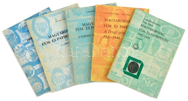 Leányfalusi Károly-Nagy Ádám: Magyarország fém- és papírpénzei 1892-1925. Magyar éremgyűjtők Csongrád megyei szervezete 1997. III. kiadás + Leányfalusi Károly-Nagy Ádám: Magyarország fém- és papírpénzei - A pengő pénzrendszer 1926-1946. Kecskemét, 1986. + Leányfalusi Károly-Nagy Ádám: Magyarország fém- és papírpénzei - A forint pénzrendszer 1946-1986. Kecskemét, 1987. + Leányfalusi Károly-Nagy Ádám: Magyarország fém- és papírpénzei - A forint pénzrendszer 1987-1991. Kecskemét, 1992. I. számú pótfüzet + Leányfalusi Károly-Nagy Ádám: Magyarország fém- és papírpénzei - A forint pénzrendszer 1992-1996. Kecskemét, 1996. II. számú pótfüzet. Használt állapotban, tollas jegyzetekkel.