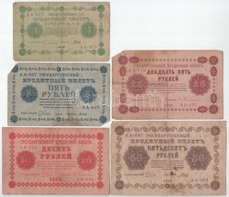 Description: Szovjetunió / Orosz Szocialista Szövetségi Szovjet Köztársaság 1918. 3R - 50R (5xklf)T:III Soviet Union / Russian Socialist Federated Soviet Republic 1918. 1 Ruble + 3 Rubles - 50 Rubles (5xdiff) C:F
