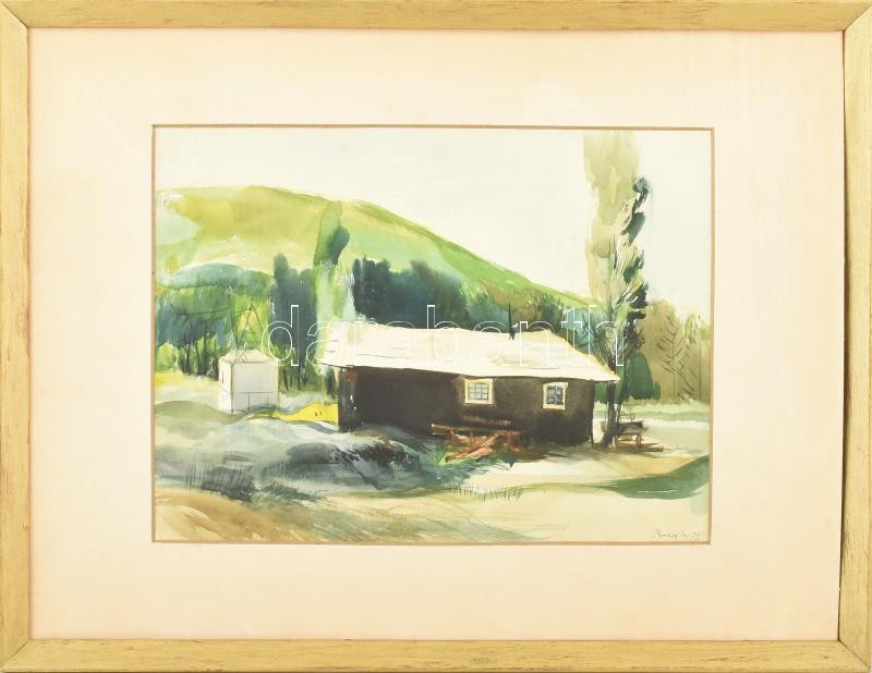 Balogh István "Tuta" (1927-2015): Ház a tájban. Akvarell, papír, jelzett. 28x39 cm Keretben