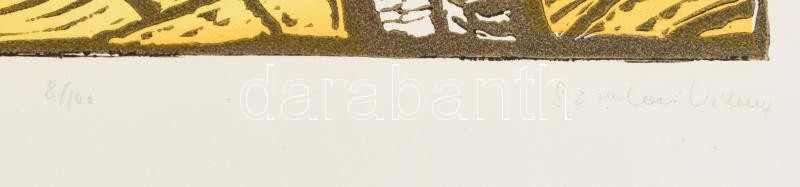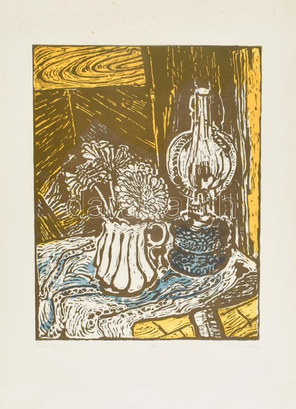 Description: Somlai Vilma (1938-2007): Kék lámpa. Színes linómetszet, papír, jelzett, hátoldalán Rézkarcoló Művészek Alkotóközössége pecsétjével, kis szakadással 39×30 cm