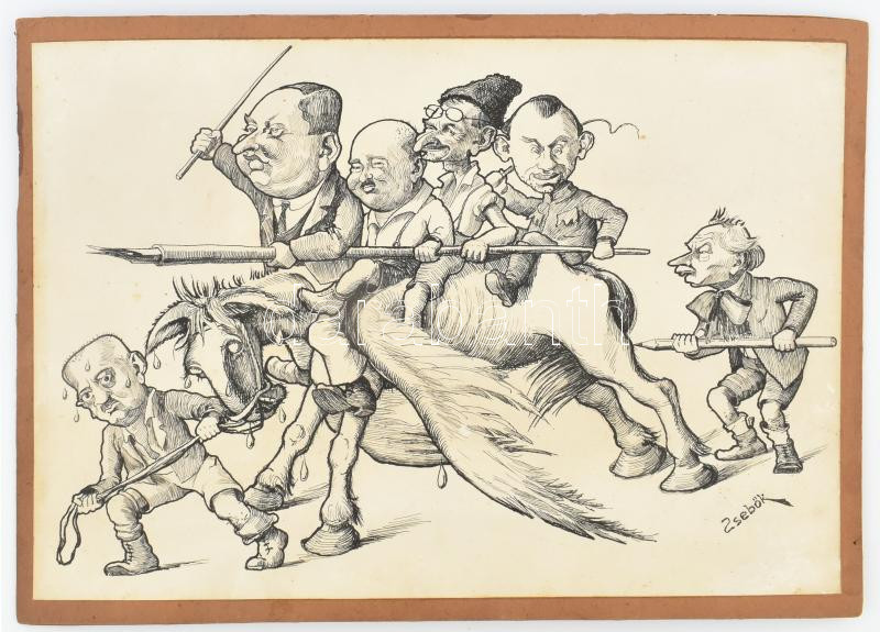 Description: Zsebők János (1872-1953): Karikatúra (hódmezővásárhelyi vagy más magyar híres személyekkel). Tus, papír, jelzett, kartonra ragasztva. Néhány apró folttal. 27x40 cm