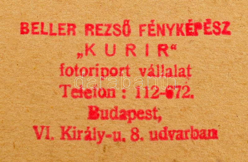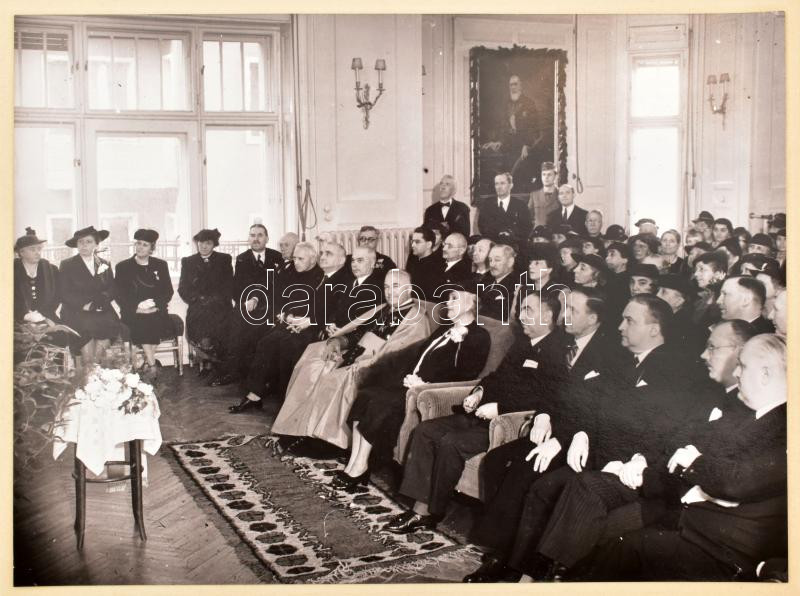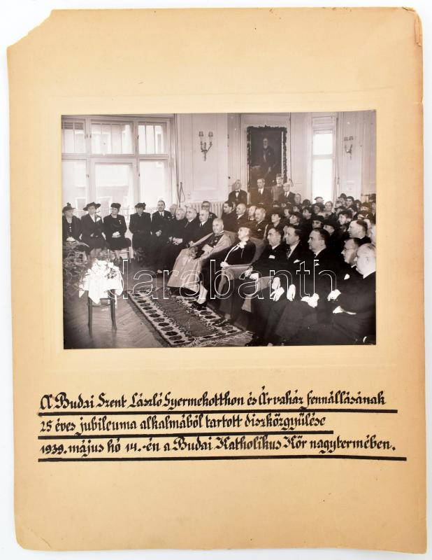Description: 1939.V.14 Horthy Miklósné kormányzóné és Hász István (1884-1973) tábori püspök a Budai Katolikus Kör nagytermében, más beazonosítandó egyházi és világi személyek társaságában, hátoldalán Beller Rezső budapesti fényképész pecsétjével jelzett keményhátú fotó, karton sérült, 39x30 cm