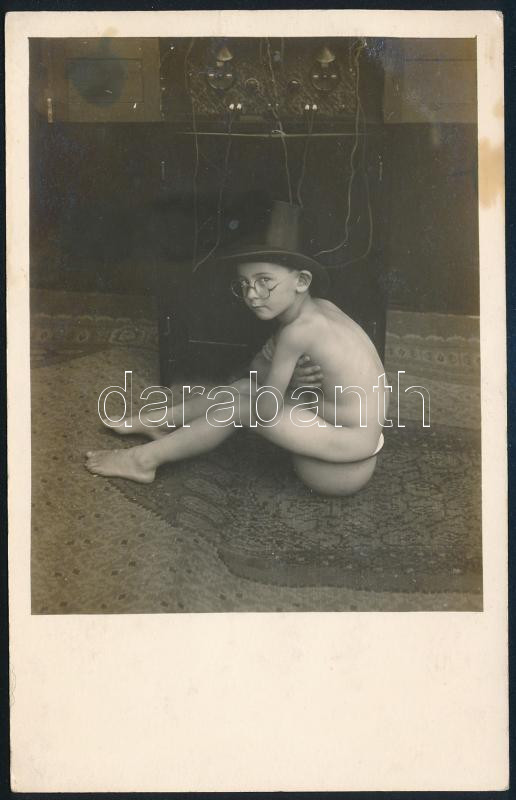 cca 1940 Bilin ülő cilinderes fiú, fotólap