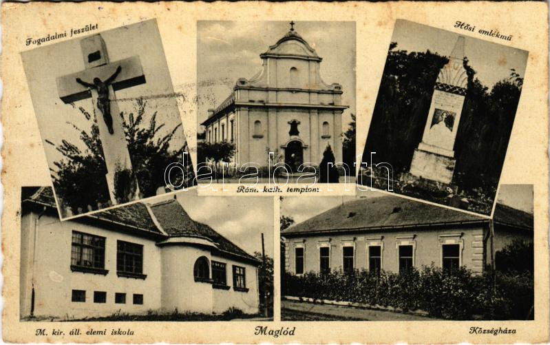 1944 Maglód, Fogadalmi feszület, Római katolikus templom, Hősi emlékmű, M. kir. állami elemi iskola, községháza, Gárdony és Fenyvesi kiadása (fl)