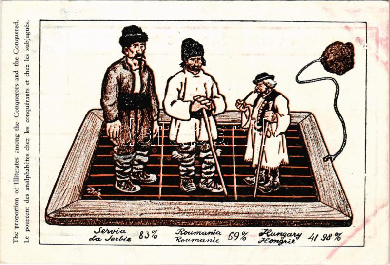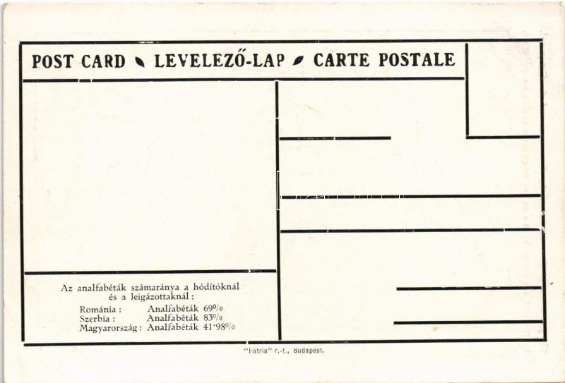 Description: Az analfabéták számaránya a hódítóknál és a leigázottaknál: Románia, Szerbia, Magyarország. Kiadja a Pátria r.-t. / The proportion of illiterates. Hungarian irredenta propaganda art postcard, Trianon s: Bér