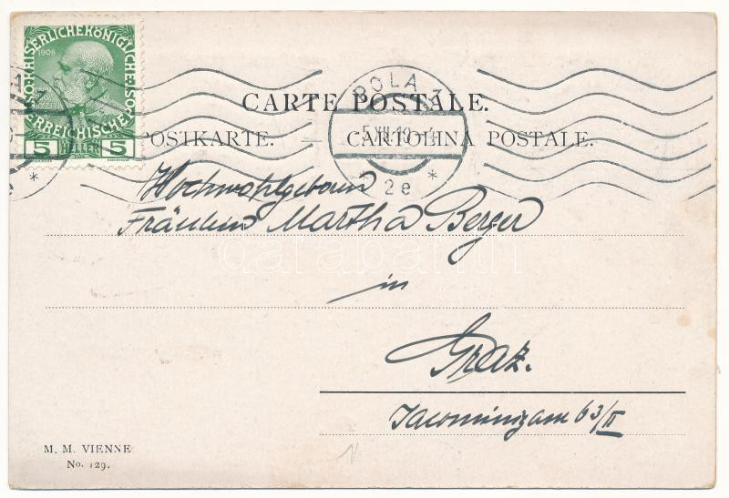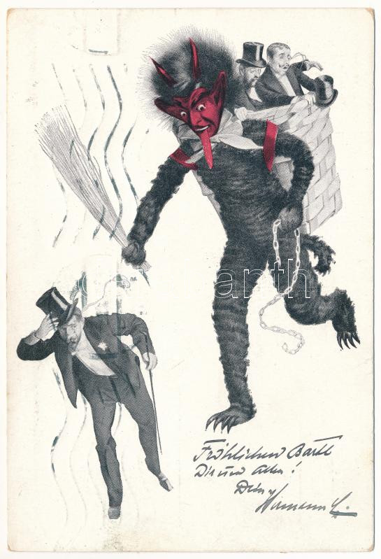 1910 Krampusz urakkal / Krampus with gentlemen. M. M. Vienne No. 129.