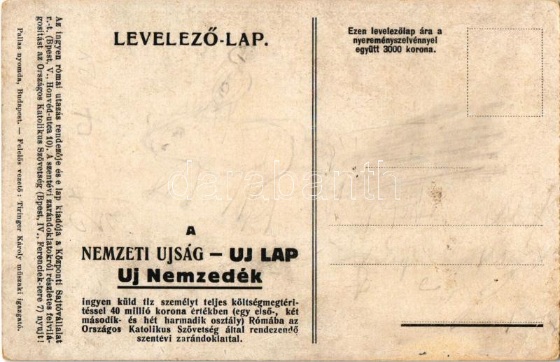Description: 1925 Pius XI Pont. Max. Szent Év Magyarok Nemzeti zarándoklata Rómába. A Nemzeti Újság ingyenes római utazás nyereményjátéka / Hungarian National Pilgrimage to Rome. Trip prize advertisement on the backside s: Tábor (EB)