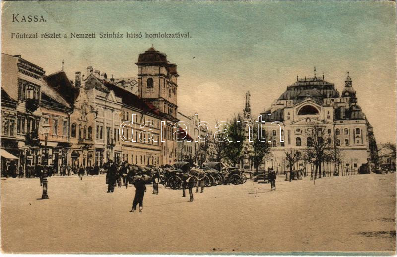 1909 Kassa, Kosice; Fő utca, Nemzeti színház hátsó homlokzata, üzletek...