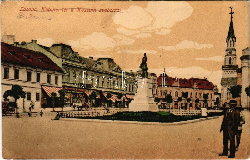 Losonc, Lucenec; Kubinyi tér, Kossuth szobor, üzletek. Bicskei Zoltán ...
