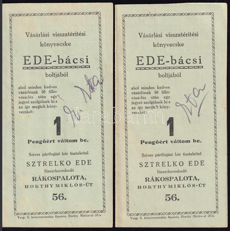 Description: cca 1930 Vásárlási visszatérítési könyvecske Ede bácsi boltjából (Sztrelko Ede fűszerkereskedő, Rákospalota, Horthy Miklós-út 56.), 2 db, benne sok bélyeggel